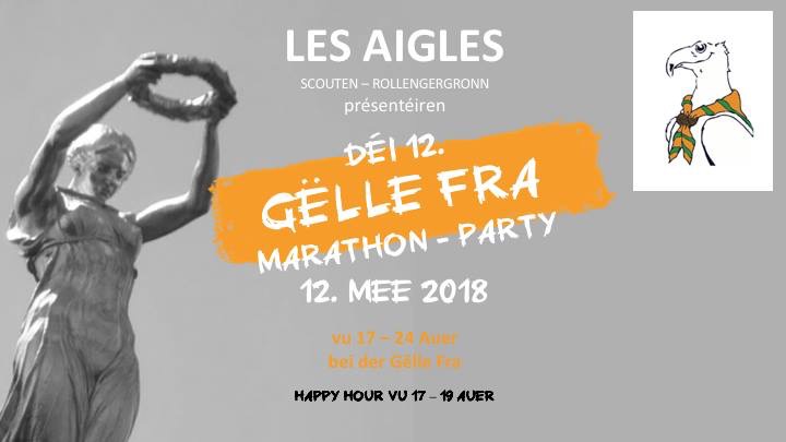 Dear Partypeople, No 12 Joër ass et jo wuel kee Geheimnis méi wou een um Owend fum ING Marathon dee bäschte Béier, déi knackegste Wurschten an déi funkiest Music fënnt. Dir kennt den Drill! INDEED! Och dëst Joer sin mir nees um Rendez-vous mat der 12ter Editioun vun der Gëlle Fra Marathon Party. Den 12. Mee 2017 gi mir nees alles, sierf dat um Macadam wärend 42 km oder um schéinste comptoir aus der ganzer Staat.