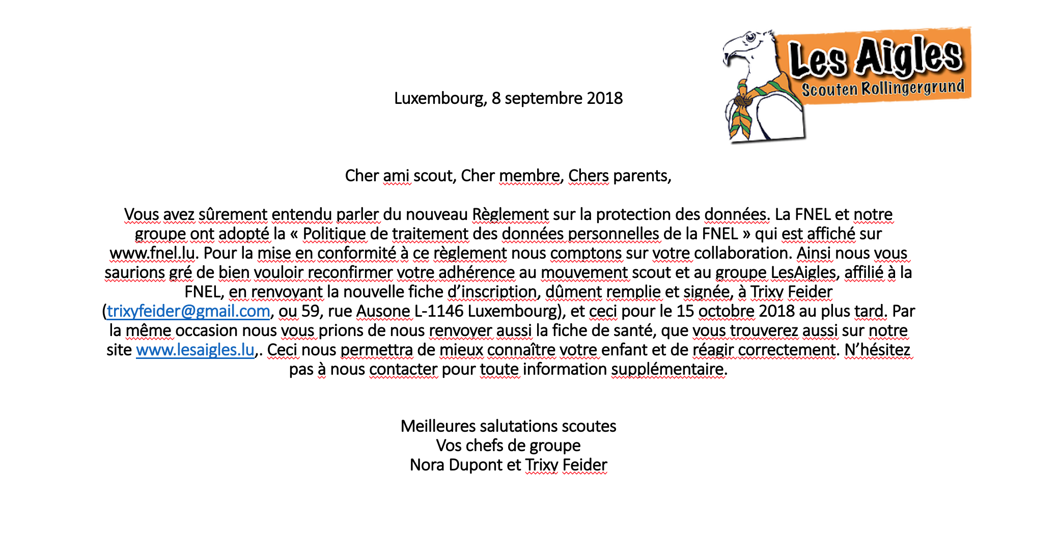 LES AIGLES – SCOUTEN IBAN LU65 1111 7019 4553 Avec la mention