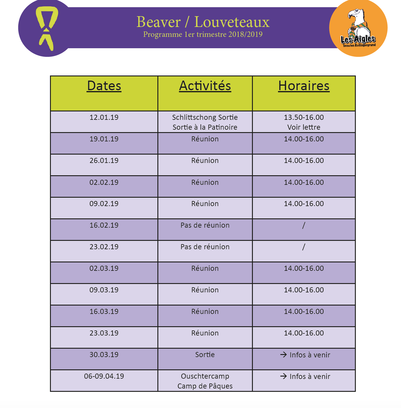 Le Weekend de la Montée s’approche ! Le 7 octobre les louveteaux les plus âgés, c’est-à-dire Carla Bidoli, Clara Girot, Noah Hanke, Max Kayser, Tom Kodesch, Victor Werner et Alisa Yunytska vont passer des louveteaux aux scouts. Cela sera un moment très important et nous leur souhaitons bonne chance pour cette nouvelle étape.